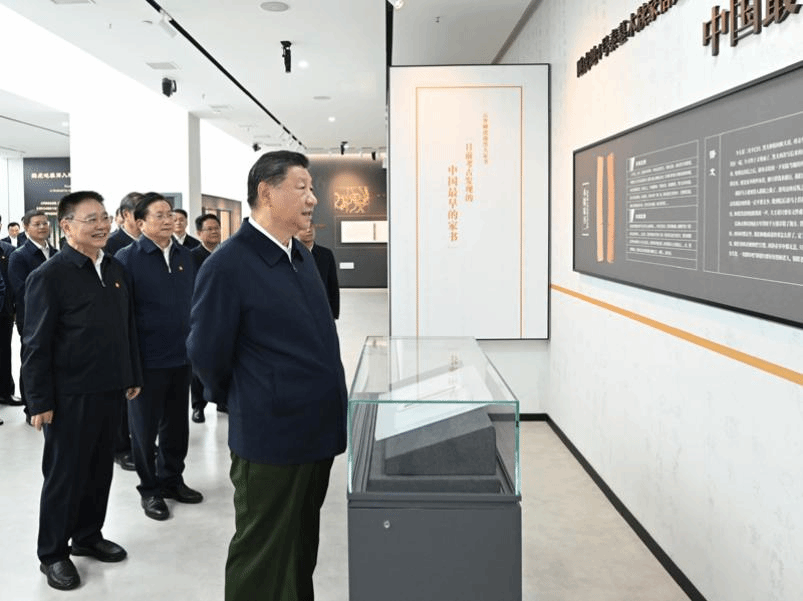 4日下午,习近平来到孝感市云梦县博物馆参观出土秦汉简牍展。展出的秦律十八种表明,早在2200多年前,我国古代法律制度就已成体系。习近平详细听取简牍内容、历史文化价值和保护研究情况介绍,指出要继续加强考古研究,提高文物保护水平,为弘扬中华优秀传统文化、增强文化自信提供坚实支撑,让中华文明瑰宝永续留存、泽惠后人,激励人们不断增强民族自豪感和自信心。