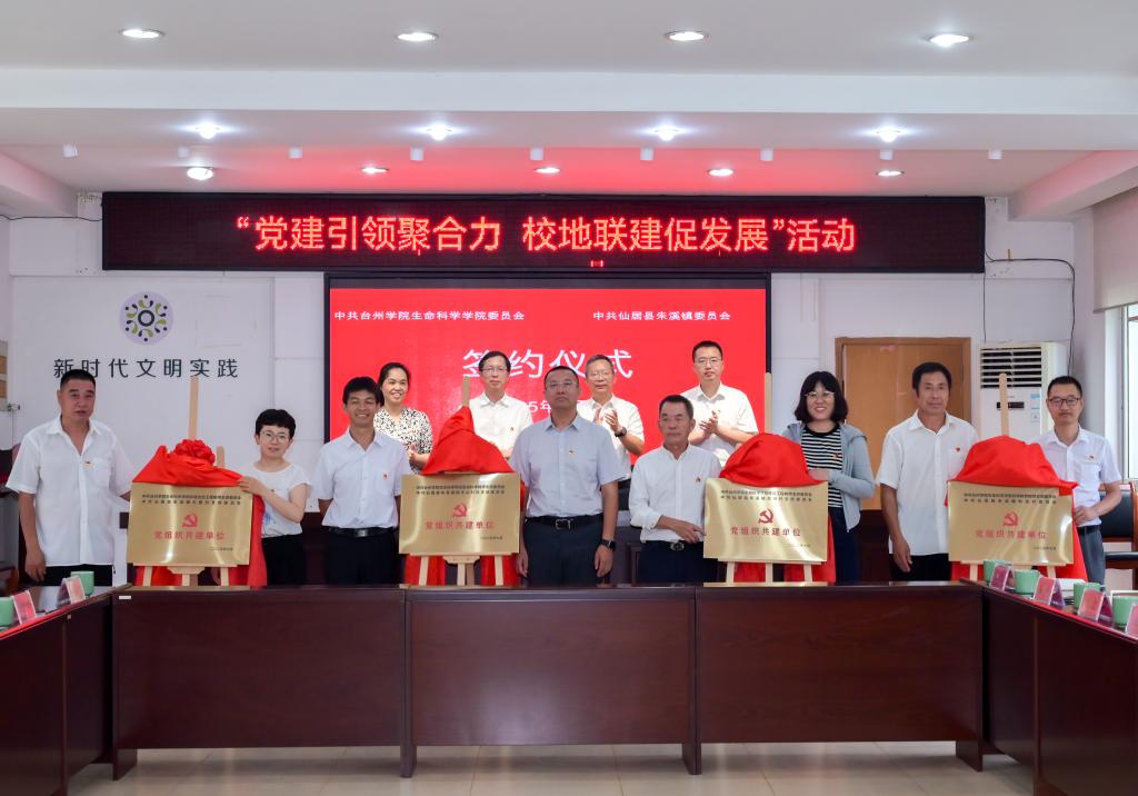 梁巍、郑晓莉代表双方签署了党建联建校地深度合作协议书。生命科学学院四个教师党支部书记与朱溪镇四个行政村党组织书记共同为共建党组织揭牌。