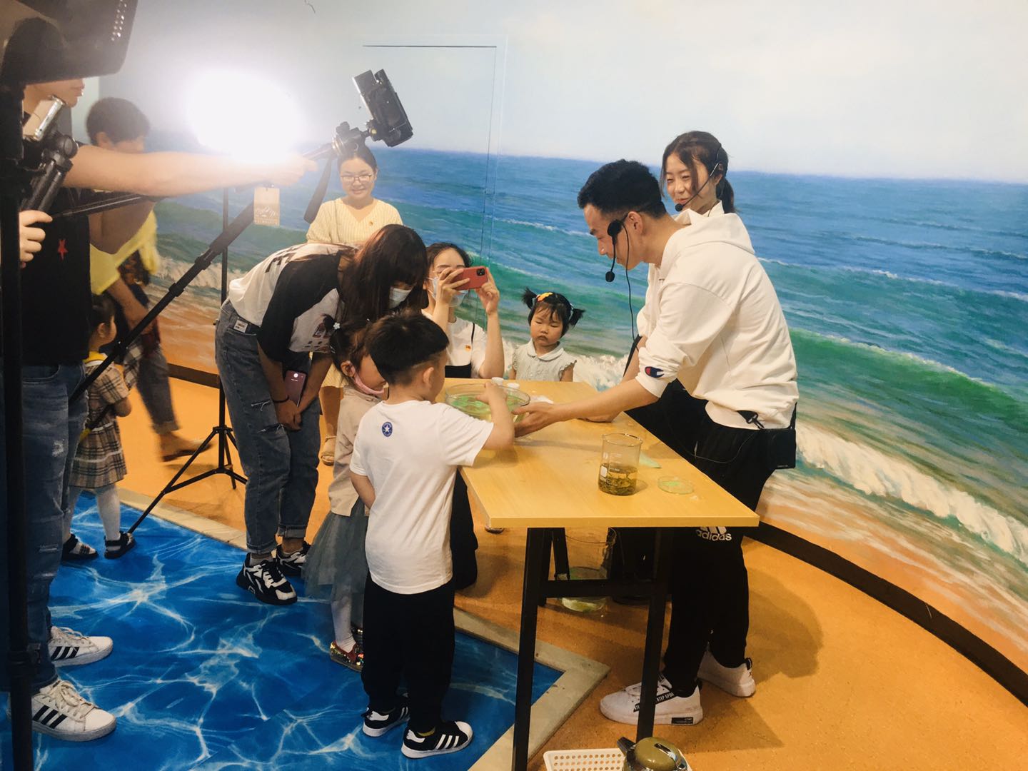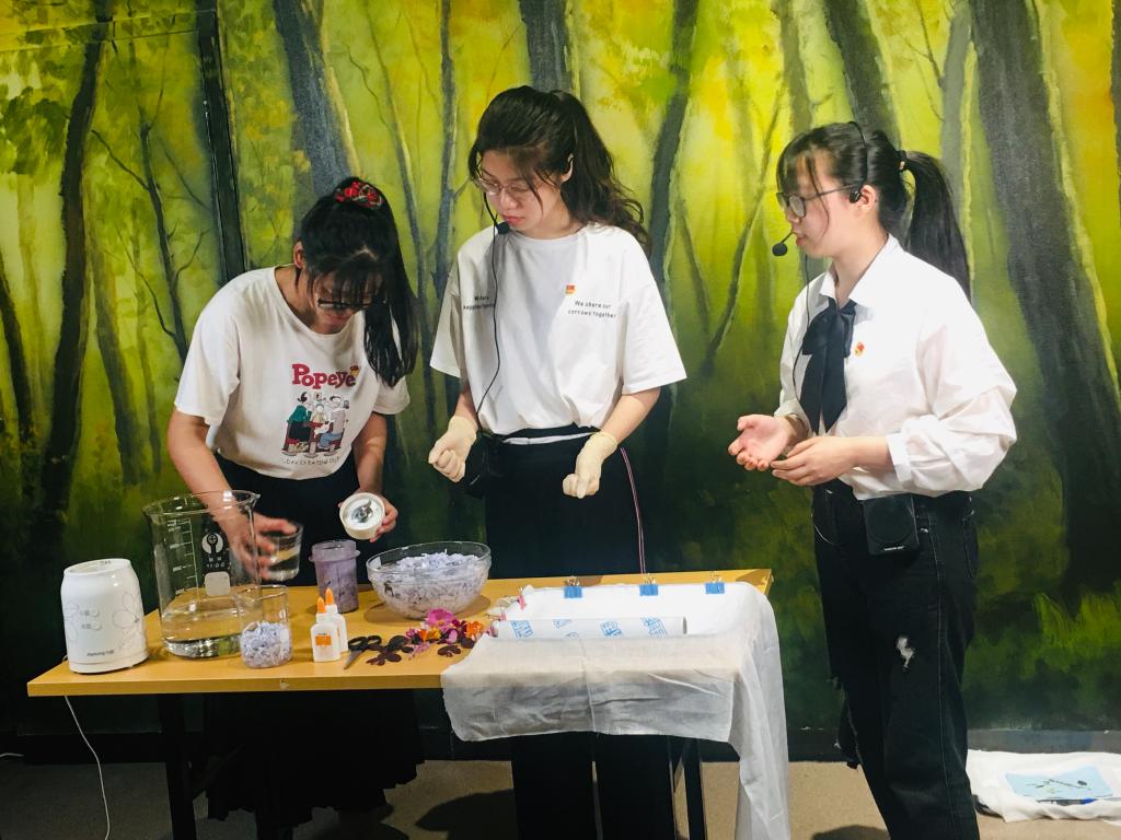 在现场展示环节,大家分成两组分别演示“水处理”魔术和花草纸制作实验,实验直观有趣,吸引了众多小朋友的围观。在互动环节,大家用通俗易懂的语言地讲解了实验的科学原理与环保知识,积极宣传“绿水青山就是金山银山的”的环保理念,营造讲科学、爱科学、学科学、用科学的良好氛围。