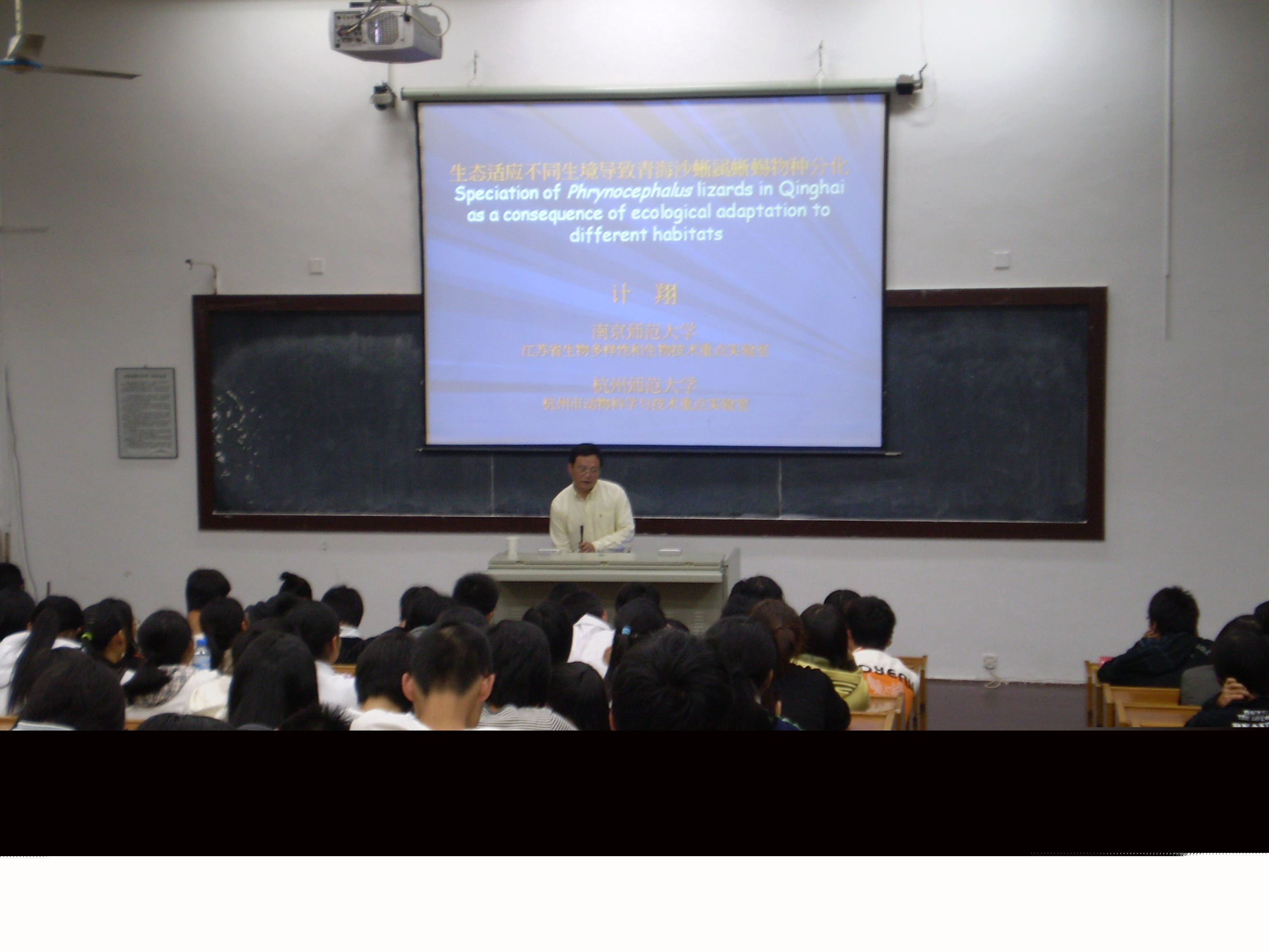 讲座中,计教授首先就两栖爬行类的研究作了总领性的介绍,引领同学们进入丰富奇妙的两栖爬行类动物领域,引起了同学们强烈的好奇心和浓厚的求知欲望。计教授进而在两栖爬行类的研究前沿与展望等方面开展生动详细地阐述,使同学们深刻领略到动物王国的奇妙和尖端的科研前景。计教授知识渊博,语言通俗易懂而不失学术的严谨性、前瞻性,尤其是他在对沙蜥物种分化这一主题的论述中,引用大量精彩图片和精确数据来比较贵南沙蜥和青海沙蜥的生理特征差异,使同学们不仅有了感性的认识,更有了理性的提高。