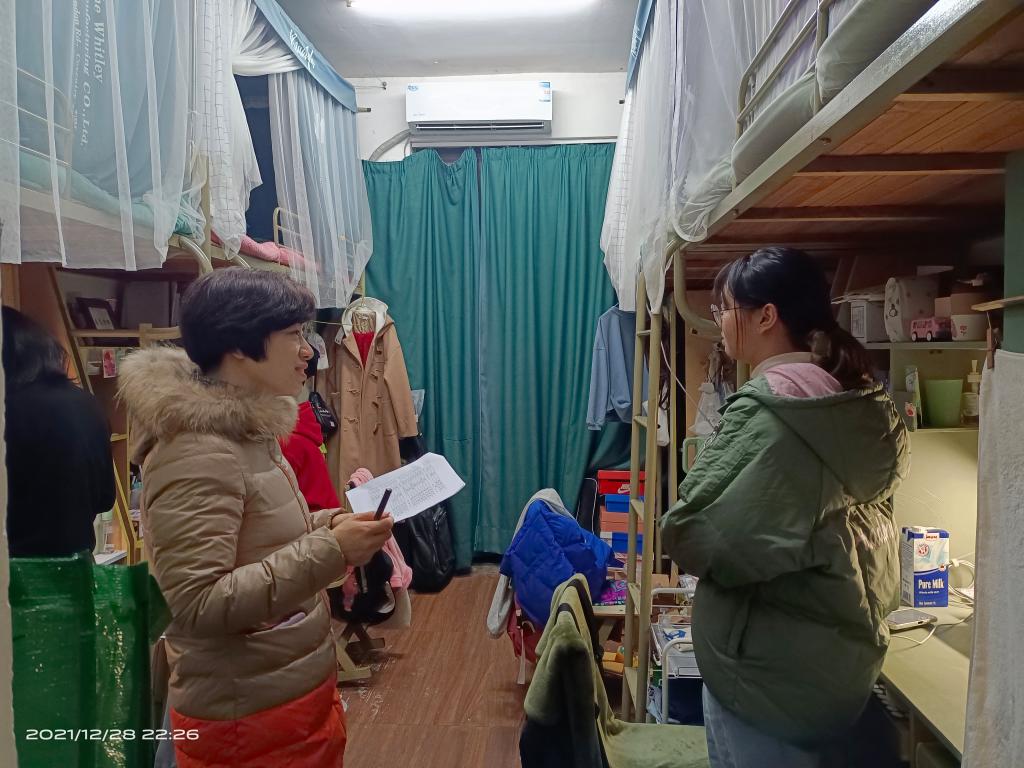 两轮检查均覆盖全院四个年级318间寝室,分6个专项检查组进行,重点针对学生晚归、夜不归寝、未请假离校及“寝室共同体”日报告打卡等方面进行了检查。各组认真排查各寝室的学生归寝情况,叮嘱同学们要自觉遵守疫情防控常态化管理下的学生寝室管理规定,并提醒大家用心备考、诚信应考。经查,学院学生寝室整体秩序良好,“寝室共同体”日报告打卡执行到位,绝大部分同学都能按时归寝,极个别同学因实验、复习等原因晚归,检查组逐一对晚归学生进行信息登记和安全预警方面的提醒。