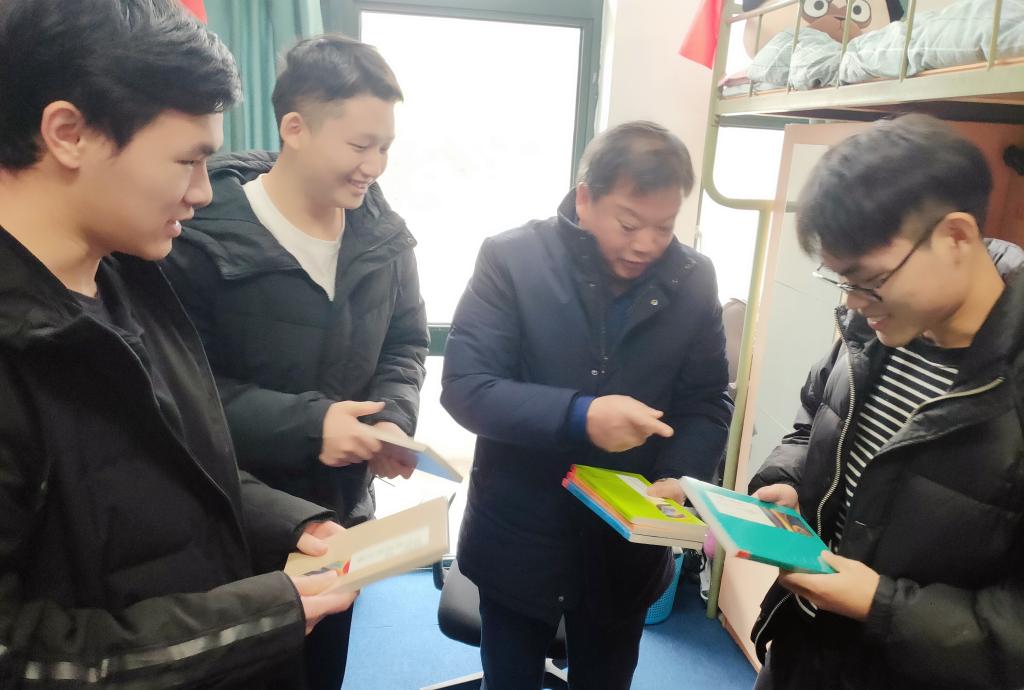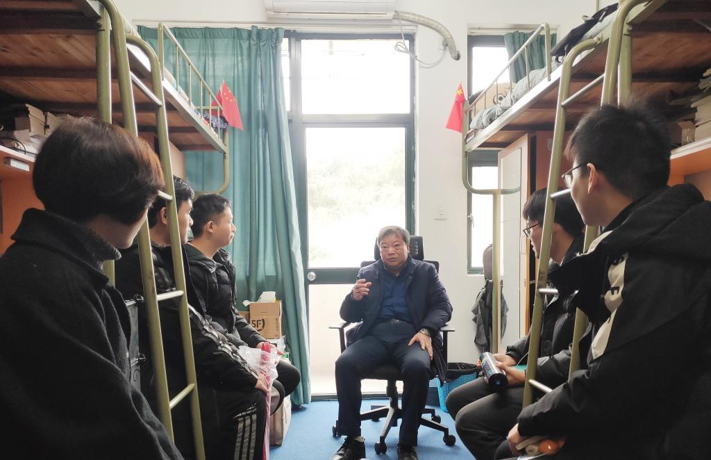 金先龙首先祝同学们元旦快乐,并送上了精心准备的励志书籍、运动器材和阿克苏苹果,祝愿大家新的一年学业进步、身体康健、快乐美满。随后,金先龙与同学们围坐在寝室内,关切地询问了大家的学习生活中的点点滴滴,从宿舍氛围到同窗情谊、从专业学习到人生规划、从感情生活到心理健康、从日常琐事到防骗提醒……他发自内心的真挚关爱让学生们倍感亲切,他幽默风趣的言语时常引得学生们会心一笑,他颇具智慧的启迪赢得学生们的频频颔首。