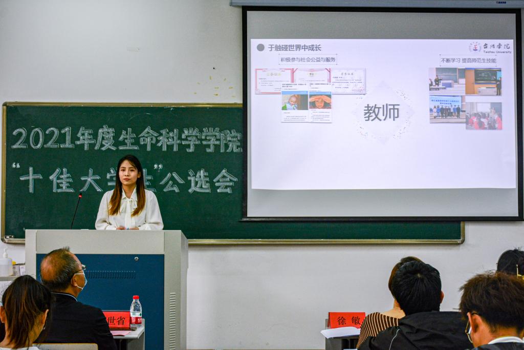 随后,14名候选人汇报展示了个人事迹,将自己进入台院以来的学习历程、个人科研成果、生活之旅展现地淋漓尽致,也表达了对于未来工作生活的美好期许。一张张荣誉证书,无不彰显着他们优异的成绩,也折射出顽强拼搏、艰苦奋斗的精神。台下观众不时响起掌声以表示对他们的肯定与赞许。最终,综合网络投票和公选会现场投票结果,蒋文杰等十位同学当选2021年度生命科学学院“十佳大学生”。