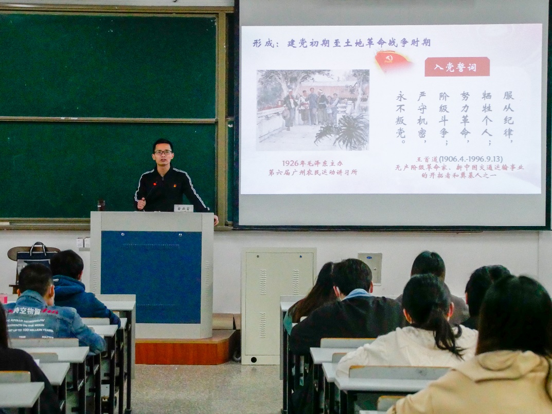5月15日晚,生命科学学院纪委委员、学工办主任、科学教育专业学生第二党支部书记翁添富在2-203为第十六期业余党校学员作“中国共产党入党誓词的演变与启示”专题党课,本期党校全体学员参加。
