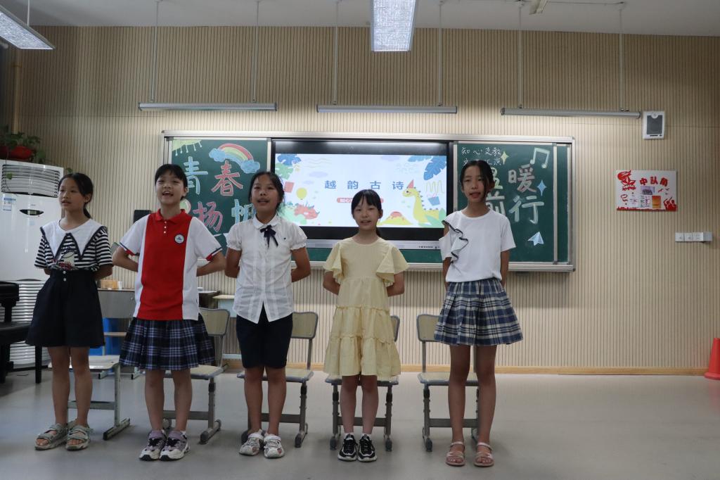 王鑫怡和蒋铭宸两位主持人宣布文艺汇演正式开始,首先开始的是团队画报展示,每一个小组分别介绍自己的小组名字、小组口号和小组成员,接着由小组代表介绍小组做的作品。然后,大家开始表演舞蹈《青春修炼手册》、课本剧《滥竽充数》、越韵古诗《赋得古原草送别》、集体朗诵《请党放心,强国有我》、合唱《明天会更好》。在游戏环节,实践队员和小学生们配合默契、乐趣横生。汇演最后进入颁奖环节,实践队员根据前几天的积分排名,给每一个小组相应的奖励。