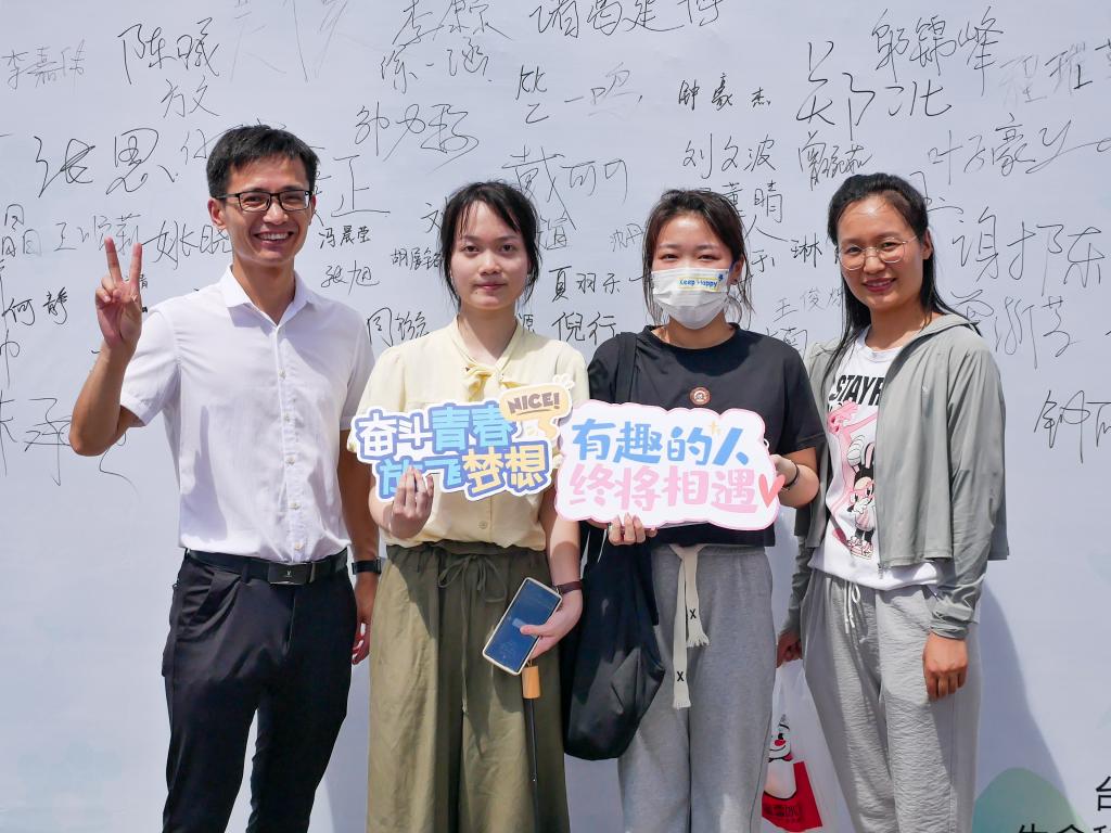 一张合影记初心。定格时间,坚守初心,为记录下萌新们初入大学的青葱岁月,学院在迎新点设置签名墙,邀请每一位新生与家长合影,他们带着对大学的憧憬和懵懂的初心,伴随着“咔嚓”一声将这一刻的美好定格。