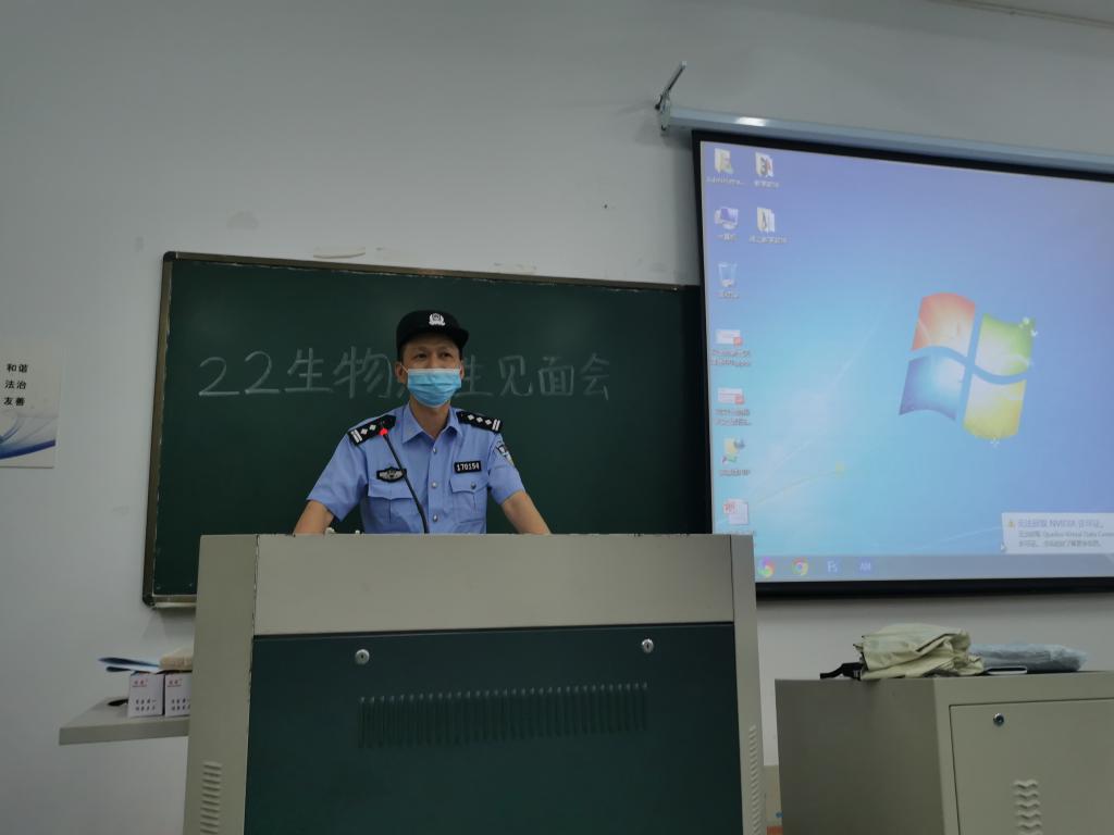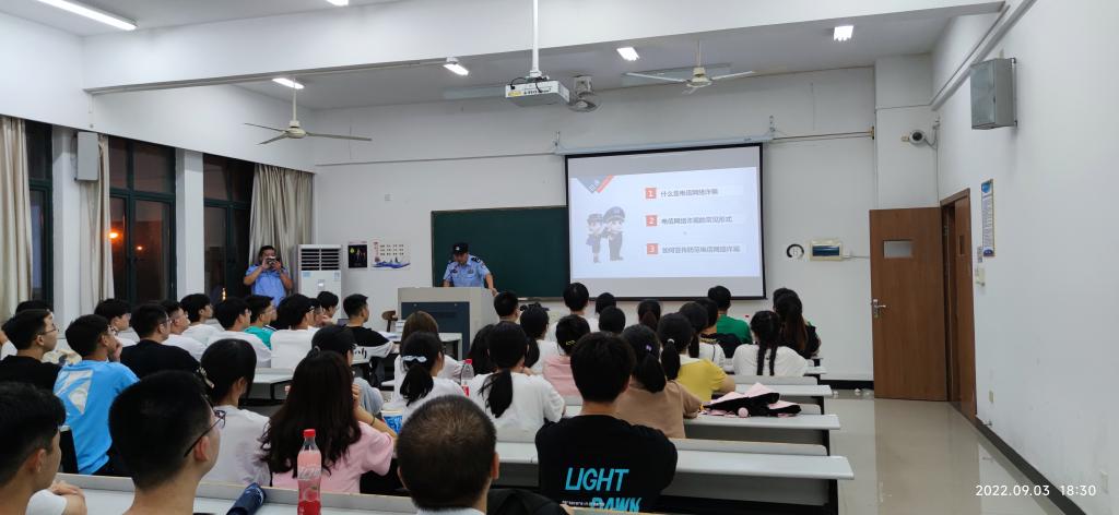 为提高新生安全防范意识,增强同学们的安全防范能力,9月3日晚,生命学院开展2022级新生反诈知识普及讲座,台州市公安局椒江分局葭芷派出所的警官们深入各班开展讲座,班主任、辅导员、党员代表、学生代表及全体新生参加。