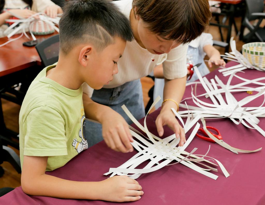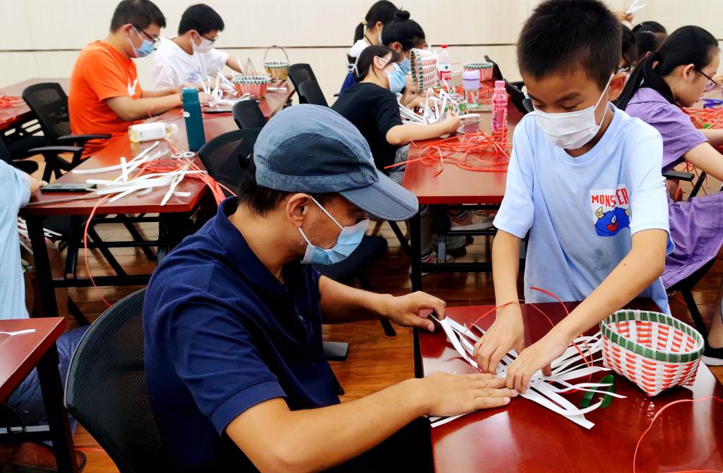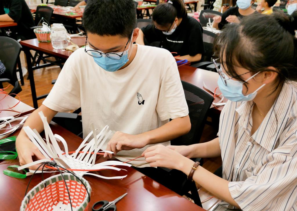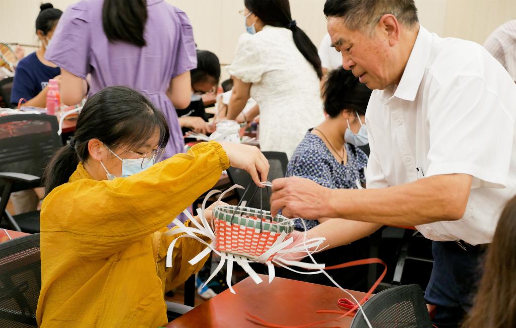 在简短的开场介绍后,林阿芳首先向大家展示并介绍了他的家用编织篮作品,大小不一、造型精美的编织篮展现出独运匠心的工艺,大家满心期待、跃跃欲试。随后,每人领取了一把长短不一、颜色各异的编织带,并在林阿芳的指导下,认真编织起来。不论是老师,还是学生,亦或者小朋友,大家都全神贯注地编织着,编织带在他们的手里旋转、交错,不多时便初具雏形。当然,初学者们的编织学习也并非一帆风顺,但经林阿芳耐心细致地教学,困难也被逐一化解。最终,一个个形态各异的编织篮在各自的努力下新鲜出炉,活动在大家心满意足的欢笑声中圆满结束。