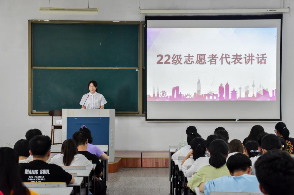 胡淑曼同学介绍了学院志愿者服务相关内容和志愿汇APP的使用方法。2022级新生代表刘彦利发言。