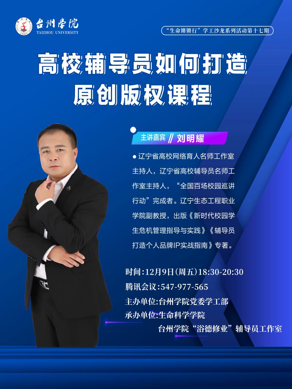 12月9日晚,辽宁省高校网络育人名师工作室主持人、辽宁省高校辅导员名师工作室主持人、辽宁生态工程职业学院学生处处长刘明耀老师应邀作客生命科学学院“生命锵锵行”学工沙龙第十七期活动,作“学生管理课程思政设计——辅导员如何打造自己的原创版权课程”专题讲座。“浴德修业”辅导员工作室全体成员现场参会、来自全国各大高校的100余名辅导员线上聆听,讲座由生命学院党委副书记徐敏主持。