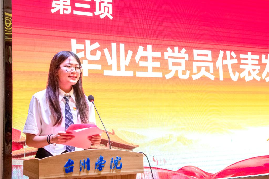 2019级科学教育2班蒋甜甜代表毕业生党员发言,她号召全体毕业生党员要肩负起新时代的重任,不负时代,不负韶华,砥砺前行,做怀揣梦想脚踏实地的人,做拥有智慧富有激情的人,做德才兼备敢挑重任的人,创造出属于自己的精彩人生,展现出青年党员的无限风采。