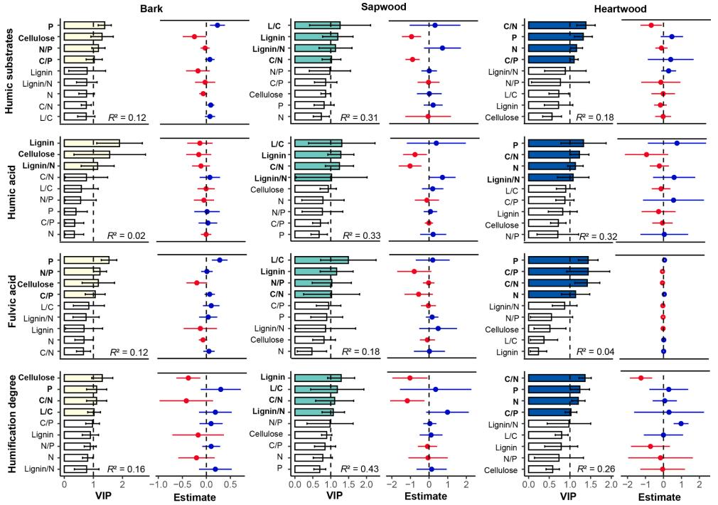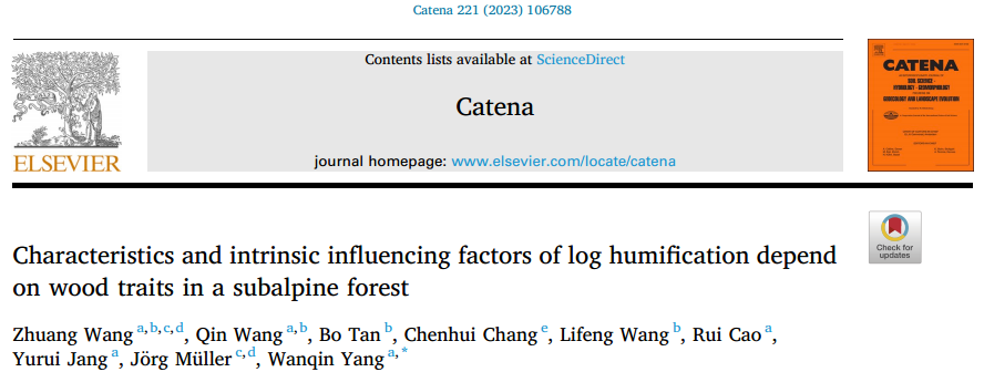 研究团队在土壤学领域期刊《Catena》发表了题为“Characteristics and intrinsic influencing factors of log humification depend on wood traits in a subalpine forest”(亚高山倒木的腐殖化特征和内在影响因素取决于倒木木质特性)的研究论文。王壮博士为该论文的第一作者,杨万勤教授为通讯作者。
