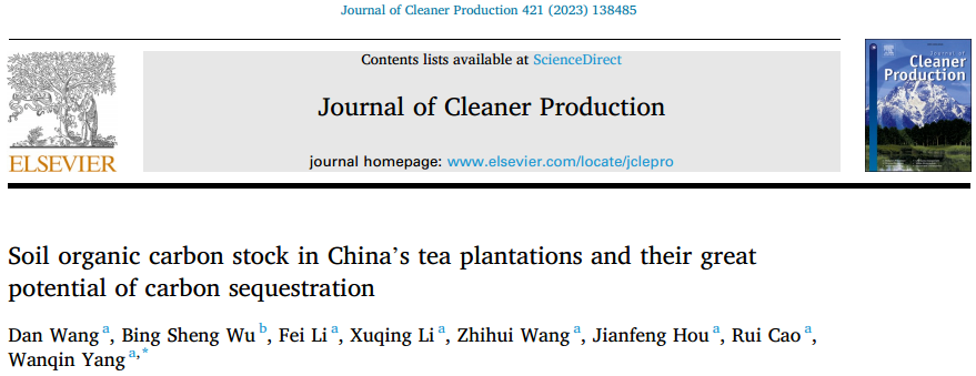 研究团队在环境与生态领域期刊《Journal of Cleaner Production》发表题为“Soil organic carbon stock in China’s tea plantations and their great potential of carbon sequestration”(我国茶园土壤有机碳储量及其巨大的碳汇潜力)的研究论文。王丹博士为该论文第一作者,杨万勤教授为通讯作者。