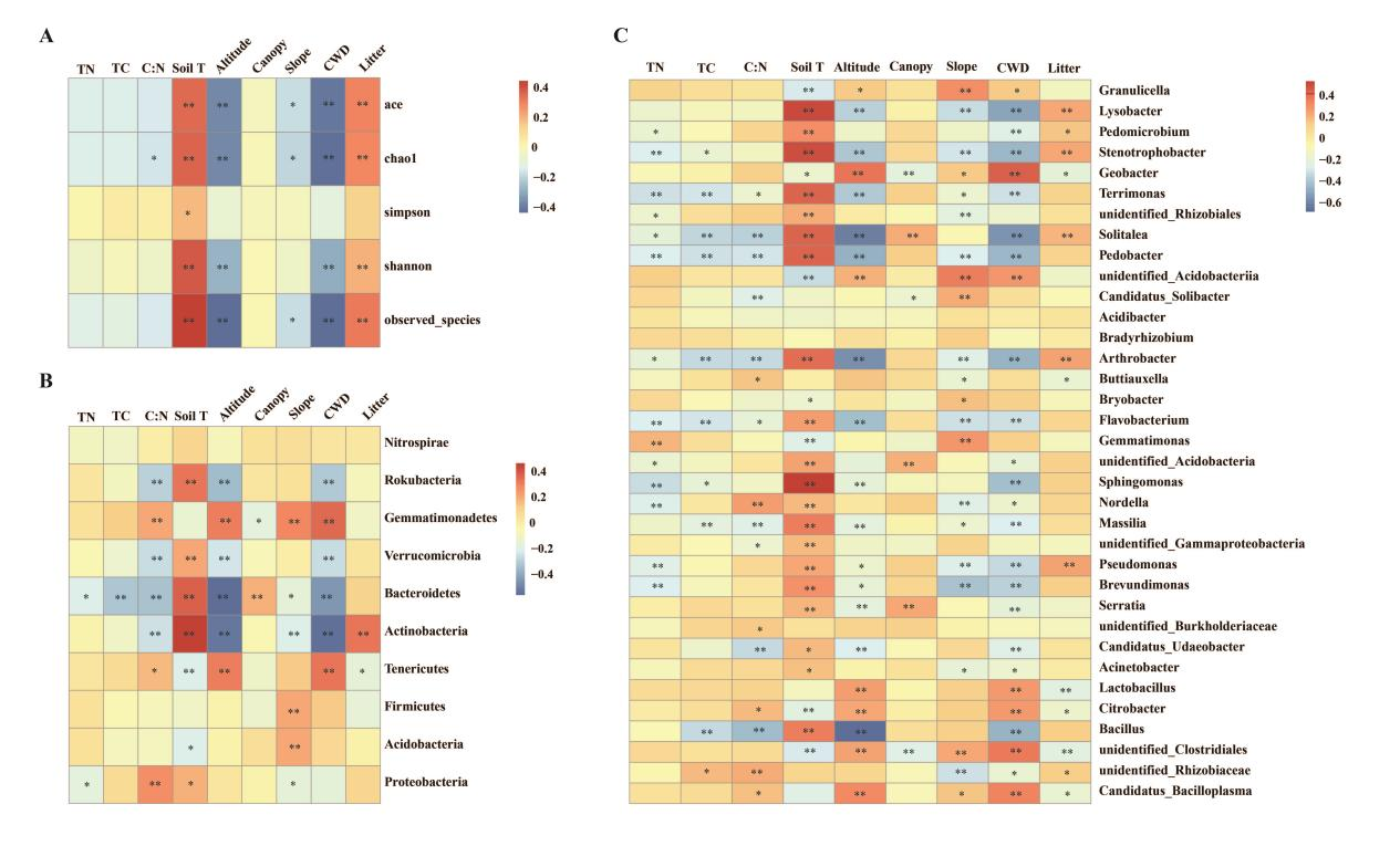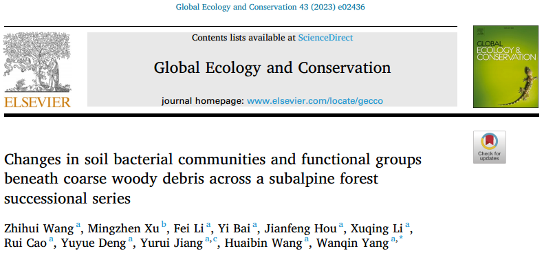 研究团队在环境与生态学领域期刊《Global Ecology and Conservation》发表了题为《Changes in soil bacterial communities and functional groups beneath coarse woody debris across a subalpine forest successional series》(粗木质残体下土壤细菌群落和功能随亚高山森林演替的变化)的研究论文。王芝慧博士为该论文的第一作者,杨万勤教授为通讯作者。