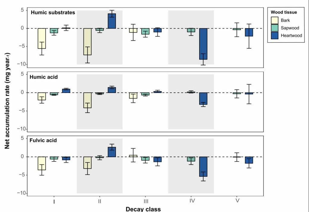 图1 不同腐解等级树皮、边材和心材腐殖质物质的积累速率