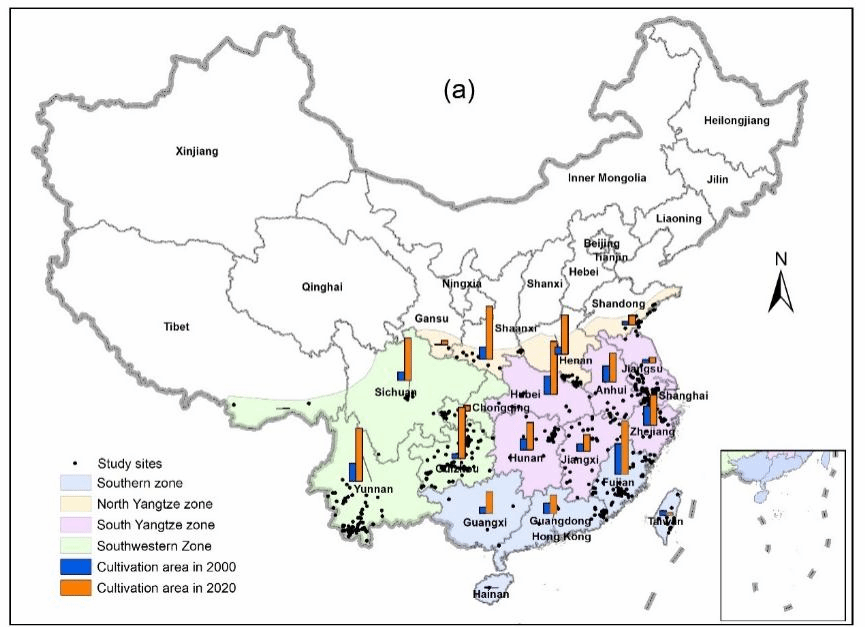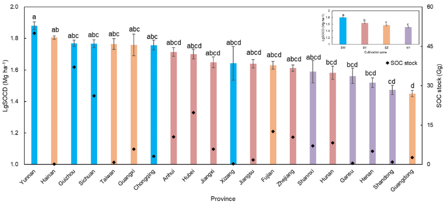 土壤在全球碳循环过程中起着重要作用。土壤有机碳储量随地理环境、气候变化和人类活动的影响产生变化。作为茶叶种植(占全球70%)和产量(40%)大国,我国茶叶种植面积逐年增加,且茶园土壤面临着严重的退化问题,但少有研究关注茶园土壤有机碳储量及其影响因素。本文通过收集322篇研究文献的1723组数据,估算了我国茶园土壤有机碳储量及其时空变化和影响因素。研究结果表明我国茶园土壤有机碳储量为207.13 Tg,其中124.58 Tg贮存于0-20cm的表层土壤中。茶园土壤有机碳平均密度为59.17 Mg ha-1,范围为0.9 - 589.54 Mg ha-1,表现出巨大的碳汇潜力。茶园土壤有机碳储量表现出明显的三向地带性和显著的种植区之间的差异。另外,茶园土壤有机碳储量明显受到土壤类型和管理方式的影响。茶园土壤有机碳储量与土壤pH和氮磷钾营养元素含量间有明显的相关性。同时,土壤有机碳储量随植茶年限的增加而增加。本文研究结果增加了对茶园土壤有机碳储量和影响因素的认识,为提高茶园土壤有机碳储量,缓解气候变化提供支撑。