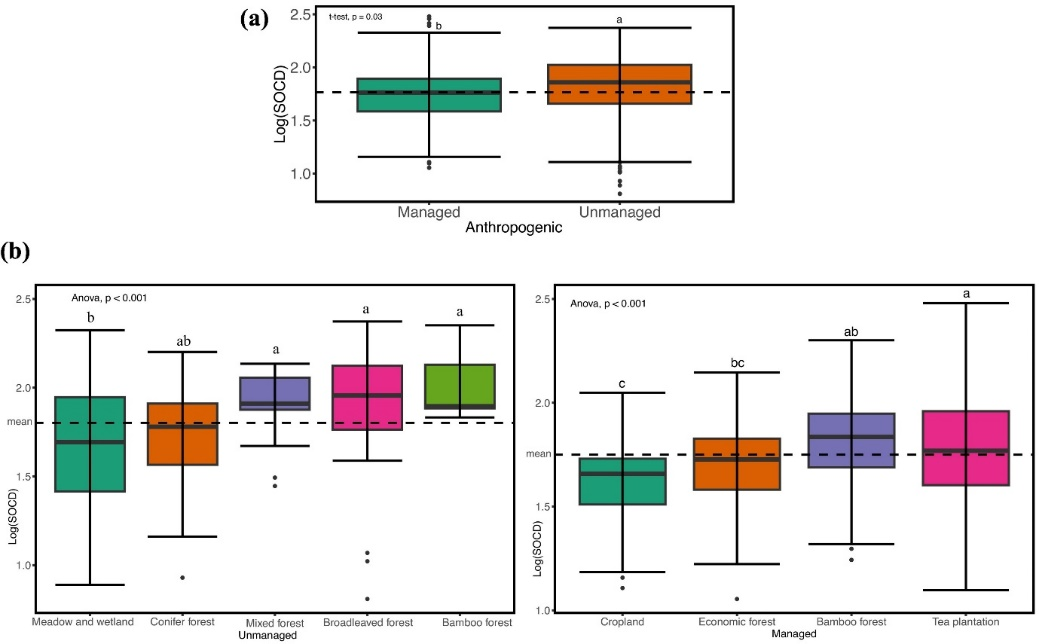 浙江省作为中国经济最发达的地区,土地管理历史长久且密集,这导致了土壤有机碳密度在不同生态系统中空间分布模式以及驱动因子的异质性。本研究基于公开出版物构建了一个综合数据集,并利用该数据集分析了浙江省从2000年至2020年期间土壤有机碳的空间分布规律以及驱动因素。我们的主要结果表明,在浙江省,人为管理的土地类型的土壤有机碳密度要低于无管理的土地,进而推断出人为管理削弱了降水和气温对于土壤有机碳密度影响的结论。本研究对于土地管理应对全球气候变化的政策制定提供了支撑。