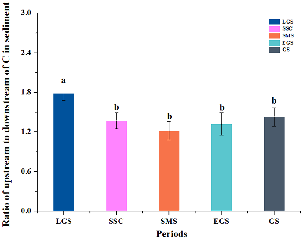 LGS、SSC、SMS、EGS和GS表示采样期,即生长后期(LGS: 9 ~ 10月)、季节性雪被期(SSC: 11 ~次年4月)、融雪期(SSC: 4 ~ 5月)、生长早期(EGS: 5 ~ 6月)和生长季(GS: 7 ~ 8月)。纵坐标的值是在此期间15条溪流的累积值。不同的小写字母表示不同时期之间的显著差异(p<0.05),相同字母表示无显著差异。