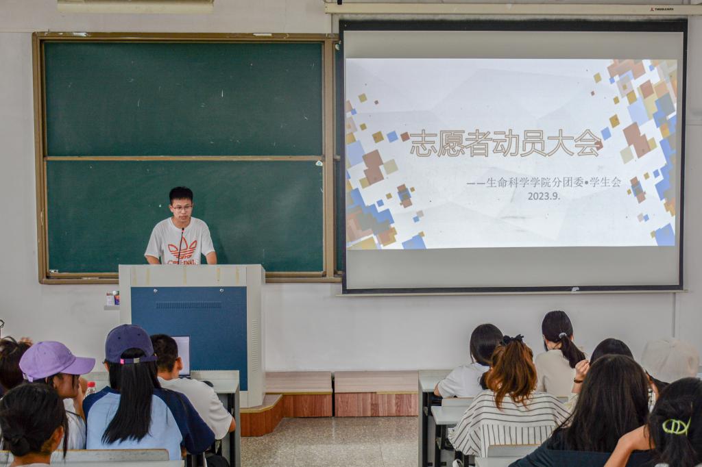 为鼓励同学们投身社会实践,找寻自己在社会上应扮演的角色和承担的责任。生命科学学院于9月27日中午分别在2-303和2-305召开了志愿者动员大会。生命科学学院分团委书记李莎莎出席,生命科学学院志愿者服务中心主任褚程航主持2-305、办公室副主任杨巨航主持2-303,全体2023级新生参加。