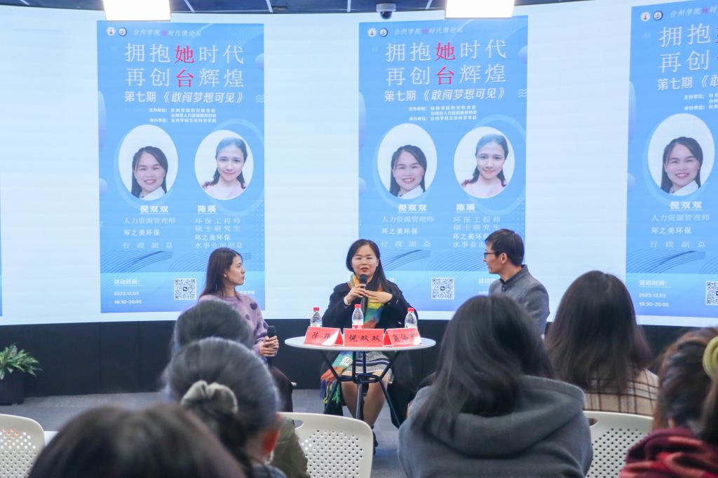 12月3日,生命科学学院在1号教学楼全景教室举办第七期“她时代”微论坛,邀请了浙江环之美环保科技有限公司行政副总倪双双、水事业部副总陈瑛作《敢闯梦想可见》主题分享。校妇联副主席、国际交流与合作处副处长、国际学院副院长王爱琴,台州市人力资源协会副秘书长柏余红和生命科学学院党委副书记翁添富出席会议,生命科学学院50余名师生代表参加活动。