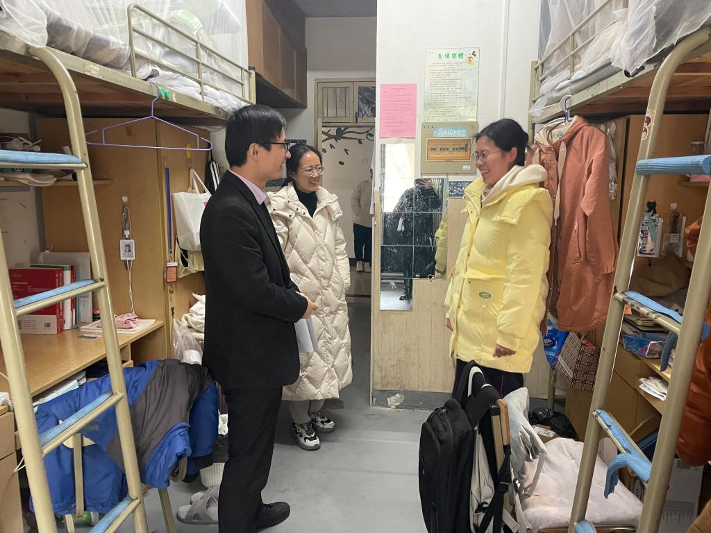 走访聚焦消防安全防范要求,针对使用违禁电器、私拉电线、杂物堆放等安全隐患问题进行了现场检查。翁添富一行与留校学生亲切交谈,关切同学们在校期间的学习、生活和实践等情况,叮嘱学生们严格遵守假期宿舍管理规定,自觉养成良好生活习惯,不断提高安全防范意识,并向同学们致以新春祝福。