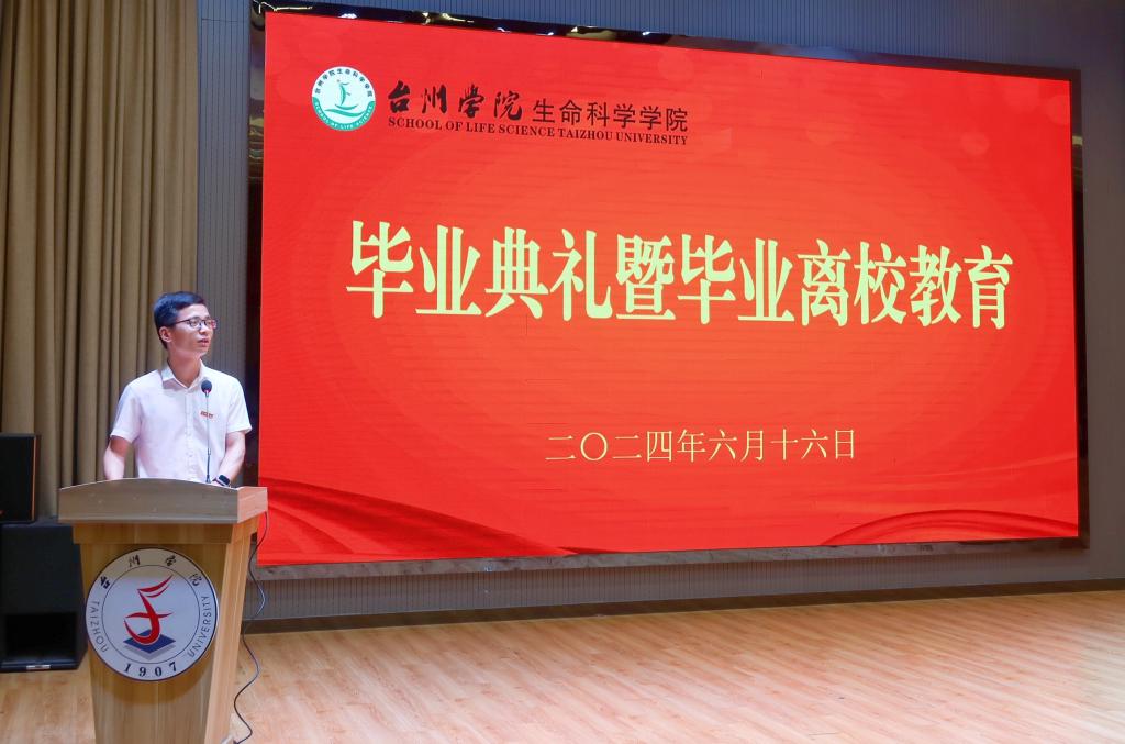 6月16日上午,生命科学学院在椒江校区大学生活动中心举行2024届毕业典礼暨毕业生离校教育。校党委副书记项凤日、学院党政领导班子出席,各系室主任、毕业班班主任、辅导员及全体2024届毕业生参加,学院党委副书记翁添富主持。