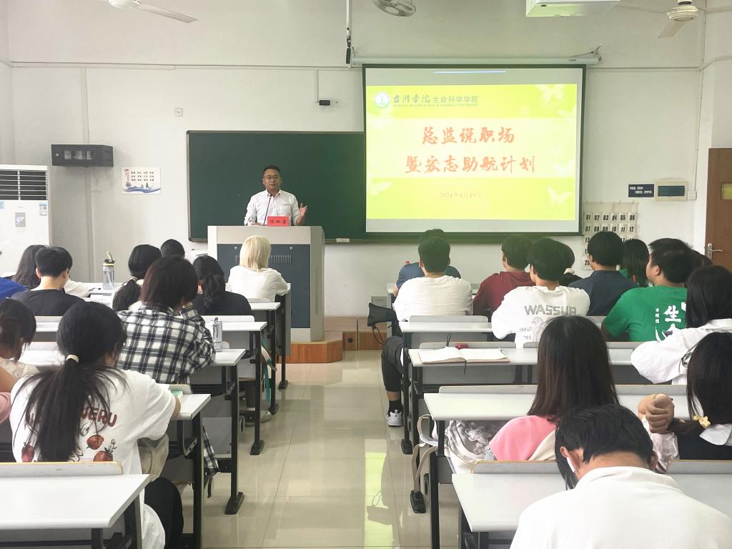 为深入落实2024届毕业生就业“百日冲刺”行动,营造“大就业”氛围,6月19日,生命科学学院“宏志助航计划”首期培训暨“总监说职场”经验分享会在椒江校区5-302教室举行,60位生物科学专业学生参加,学院党委副书记翁添富主持活动。