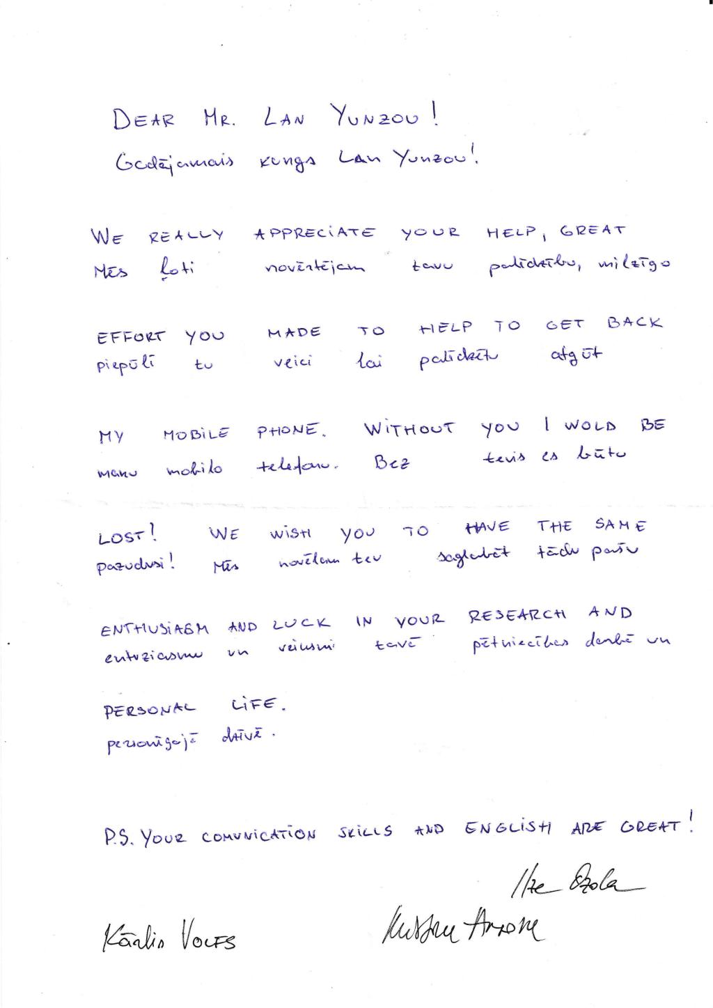Ilze Ozola博士对曾老师的热情接待和全程陪同表示衷心感谢,并对蓝同学的周到服务和出色表现给予了高度评价。为了表达感激之情,她亲自手写了一封感谢信,信中充满了对蓝允邹同学的赞赏以及对我校的深厚情感,并诚挚邀请学校师生参加2028年在拉脱维亚举行的第十八届国际泥炭地大会。