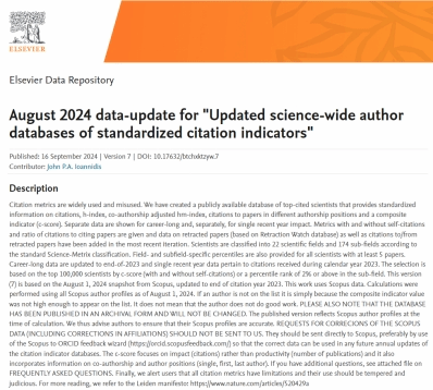 全球前2%顶尖科学家榜单由斯坦福大学John P.A. Ioannidis教授团队与国际权威学术出版社Elsevier合作的项目成果,发布在Elsevier旗下的Mendeley Data网站上。榜单基于Scopus数据库的引用数据系统分析,对全球约700万科学家的论文引用数(区分自引和他引,提供自引数据)、H指数、合著者调整的HM因子、单独或第一作者的文章引用数等参数进行综合考量,涵盖文、理、工学科,收录来自22个学科领域、176个子学科领域全球排名前2%的科学家,能够更客观、更真实地反映科学家的产出量和学术影响力,为科学家长期科研表现提供了一个衡量指标。