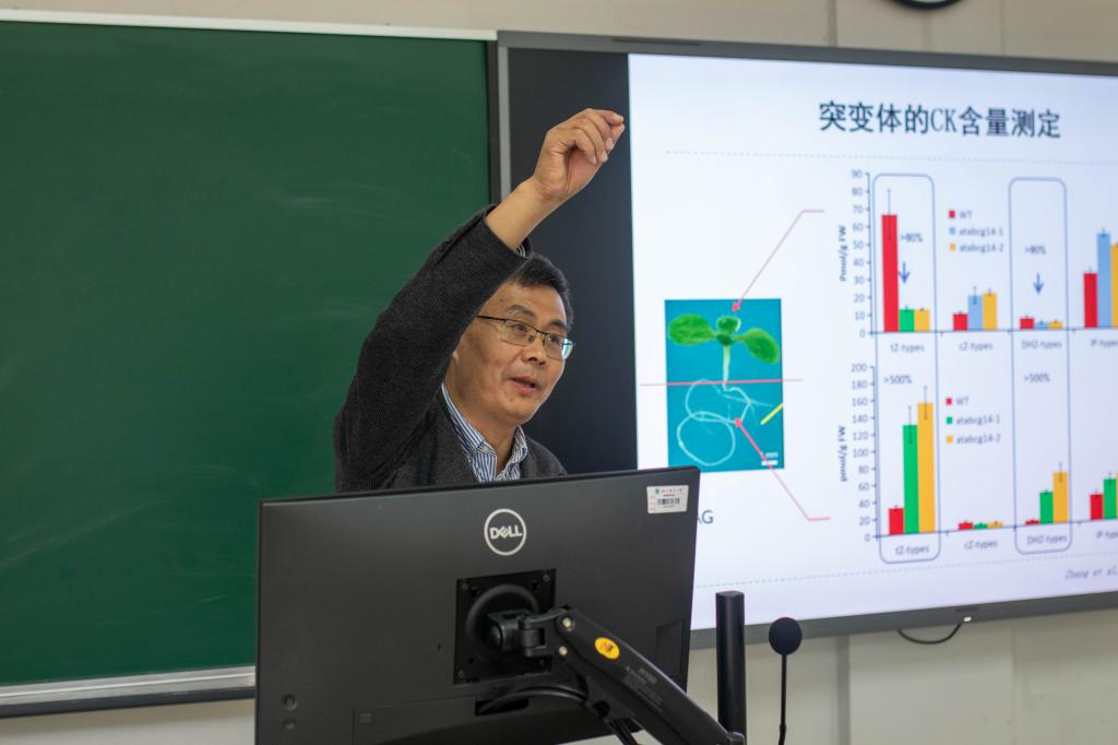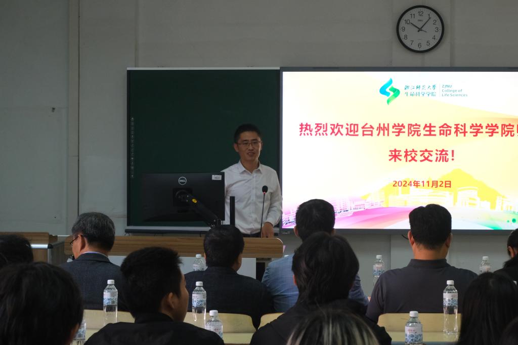 浙江师范大学生命科学学院党委副书记朱慧、副院长宗宇、浙师大生物学一级学科负责人张可伟教授及师生代表参加学术报告和交流座谈会。宗宇代表浙师大生科院对我院来访表示热烈的欢迎。张可伟教授作《细胞分裂素运输和分解代谢研究》学术讲座,齐鑫作《大中小学科学教育一体化协同育人》成果交流汇报。在交流过程中,双方介绍了各自学院的办学历史,对“双创”三大赛事的培育与申报、生物科学创新拔尖人才班教育教学建设、协同推进大中小学科学教育创新人才培养一体化建设等进行了深入探讨和优秀教学案例展示。