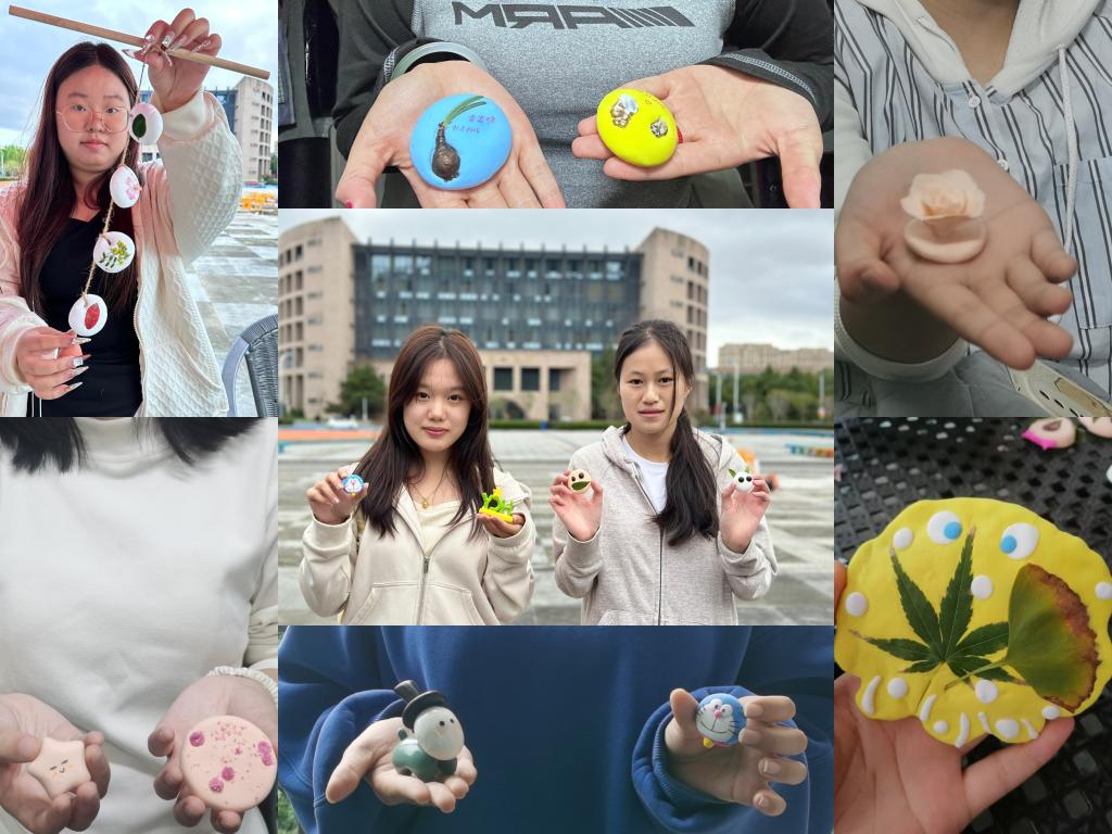 同学们在校园内自行捡拾,采摘飘落的树叶、落花、落叶等自然元素。将这些元素压入粘土中,精心制作风铃造型、卡通造型等别出心裁的植物标本。活动中,参与者们一边制作手作一边分享自己的创作灵感,进一步加深了彼此之间的了解与友谊。