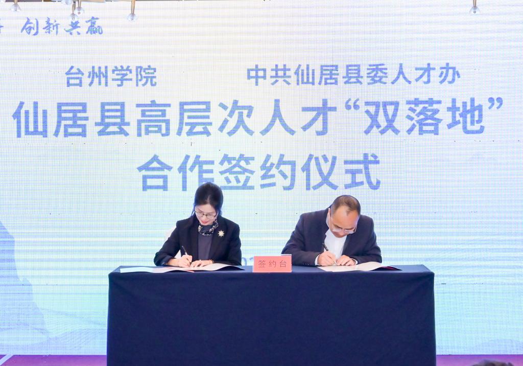 郑丽君与仙居县委组织部副部长曹海风分别代表台州学院和中共仙居县委人才办签订了高层次人才“双落地”合作框架协议。