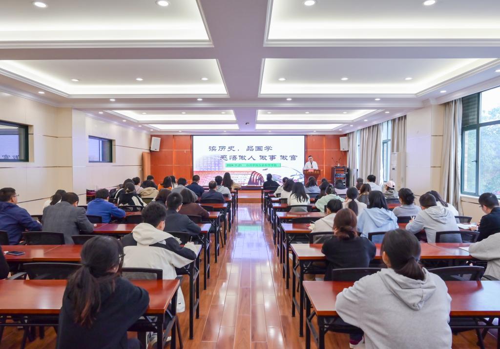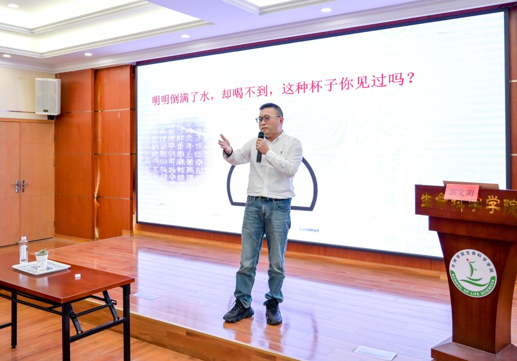 郭文明以“一个杯子引起的思考”导入,讲述孔子观器论道的典故,引出“做人不可贪,万事皆有度”的为人处世分寸;他从“人”字的一撇一捺缓缓道来,引经据典,以其深厚的理论功底和鲜活的真实案例,深入浅出地阐述了党员干部做人做事要把握好“政治上有高度,思想上有深度,能力上有强度,知识上有广度,心理上有气度”这五个“度”。授课案例丰富、贴切实际、别样生动,既是一次对党员干部的警示教育专题党课,也是一次对师生党员的明德修身思政教育课,令广大师生深受启发,受益匪浅。
