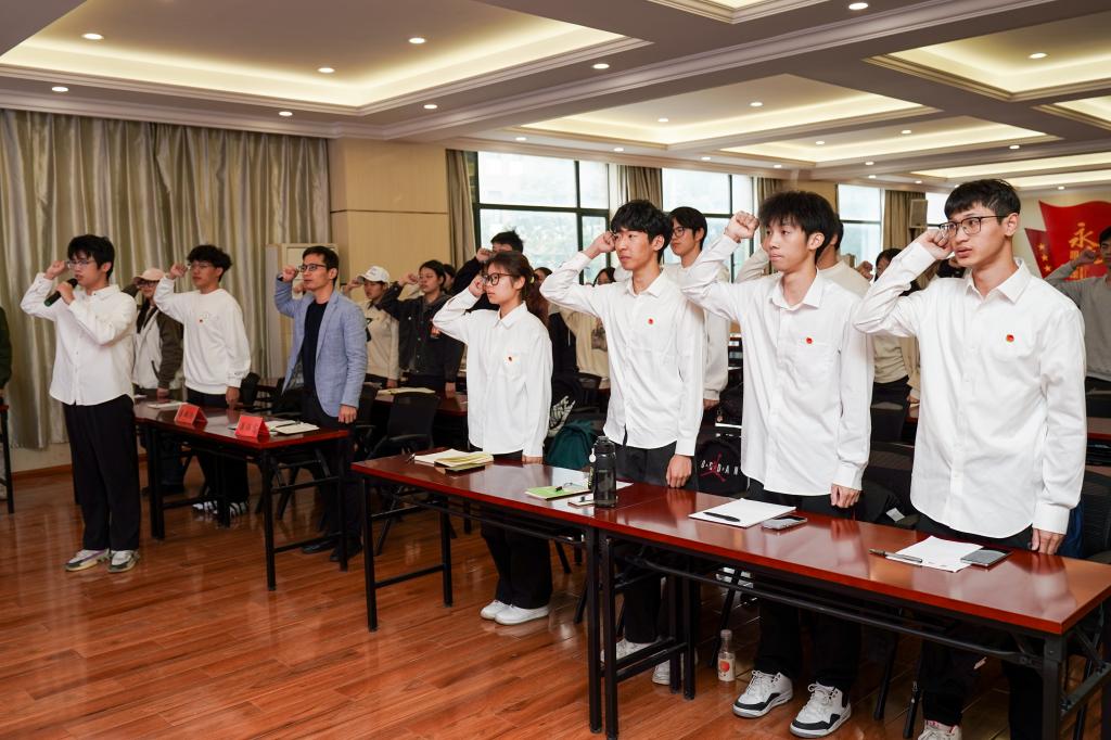 在庄严的国歌声中,入团仪式正式拉开序幕。吴政浩宣读新团员名单,并对学院21名新团员表示祝贺。随后,翁添富为新团员代表佩戴团徽,吴政浩带领全体新团员作入团宣誓,新团员代表及优秀团员代表贾棋铖、陈瑜尉同学分别发言,表示将积极发挥团员先锋模范作用,在学习、生活、工作中发扬优良作风,让青春绽放绚烂光彩。