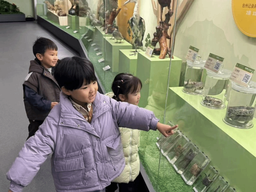 坐落于台州学院图书馆六楼的生物多样性展览馆,是台州学院多年生物多样性调查成果与台州市地方特色动植物标本的璀璨展示之地。馆内分展区陈列了珍稀濒危植物、鸟类、哺乳类、两栖爬行类、软体动物等多个类群的代表性动植物标本,为小朋友们呈现了一个生动而奇妙的生物世界。