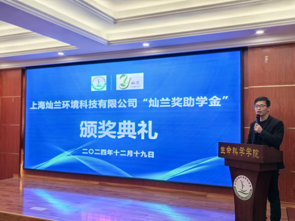 12月19日,生命科学学院在学院大会议室举行“灿兰奖助学金” 颁奖典礼。上海灿兰环境科技有限公司董事长朱文志、总经理曹卫东、人事经理李玉,生命科学学院院长赵凯、党委书记郑晓莉、副院长付永前出席。学院辅导员和环境工程专业、环境生态工程专业学生代表参加,典礼由学院党委副书记翁添富主持。