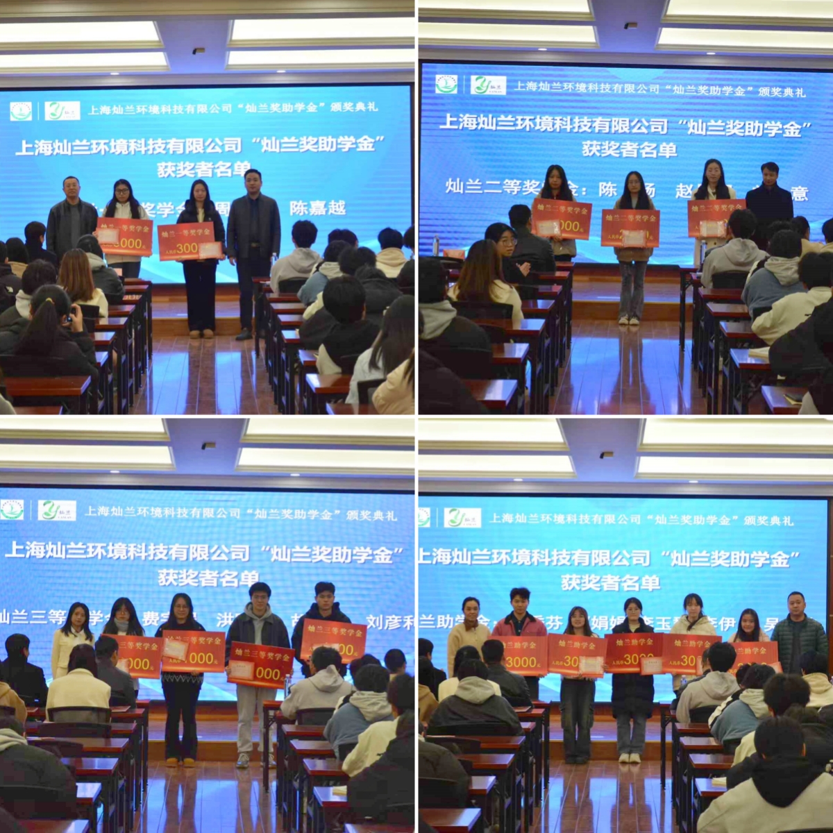 周佳琪、陈嘉越等9位同学获“灿兰奖学金”,贾季芬、郭娟娟等5位同学获“灿兰助学金”。22级环境工程专业学生刘意,21级环境工程专业学生、上海灿兰环境科技有限公司实习生陈杨分别作为获奖学生代表发言。