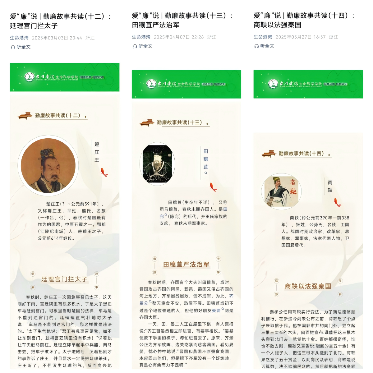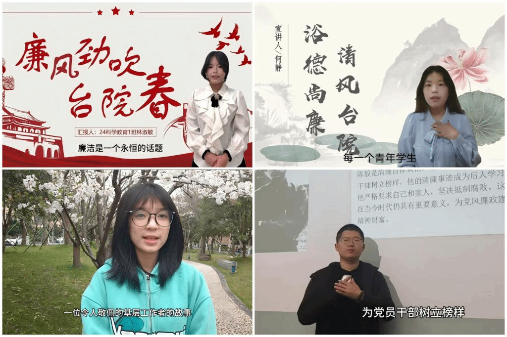 在“清风沐台院,廉洁我先行”清风宣讲大赛中,同学们以视频投稿的形式积极参与。参赛视频内容丰富多元,同学们通过真挚表达,让廉洁故事深入人心。“笔耕扬廉洁,墨香润德行”书法创作活动同样精彩纷呈,活动一经发起,便迅速得到全院师生的积极响应。同学们铺展宣纸、研磨挥毫,将对廉洁文化的理解倾注于笔端。此外,学院“生命港湾”公众号精心打造“爱廉说”勤廉故事共读栏目,通过讲述古今廉洁典范事迹,引导师生在文字共鸣中筑牢崇廉之心;学院楼内匠心打造的廉洁文化作品展墙,以图文并茂的形式陈列师生原创的书法、绘画、摄影等廉洁主题作品,让廉洁文化以可触可感的艺术形态浸润学院每个角落。