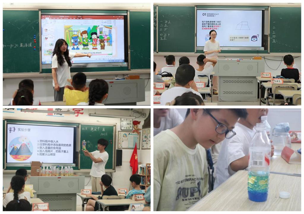 实践队巧妙融合知识与趣味,打造活力课堂,让知识不再是书本的枯燥符号。孩子们在“四色定理”填色游戏和“一笔画”挑战中解密数学、挑战逻辑,在《“英”你而幸福》的歌声里感受跨越国界语言的魅力,更在“海底火山”等趣味科学实验台前屏息凝神,于泡沫喷涌的瞬间领悟科学原理的神奇---求知的种子,悄然播撒在乡野童心。