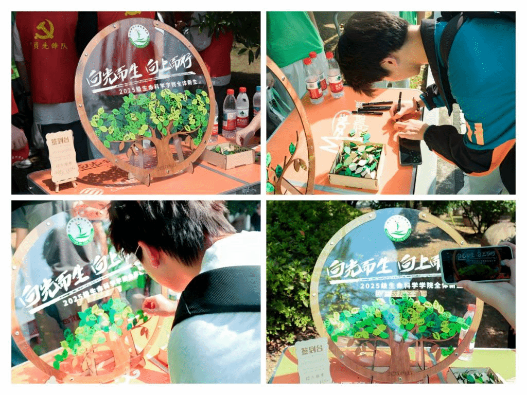 大树因绿叶而展其繁荫,绿叶因大树而得其根基。迎新现场的“生命树”吸引到来的新生,他们纷纷拿起笔,在充满希望的绿叶上郑重写下姓名,放于树冠,象征正式成为生命科学学院大家庭的一员。随着片片“新绿”成长汇聚,“生命树”逐渐葱茏,寓意新生在学院的滋养下向阳而生、向上而行,生命之旅自此精彩启航。