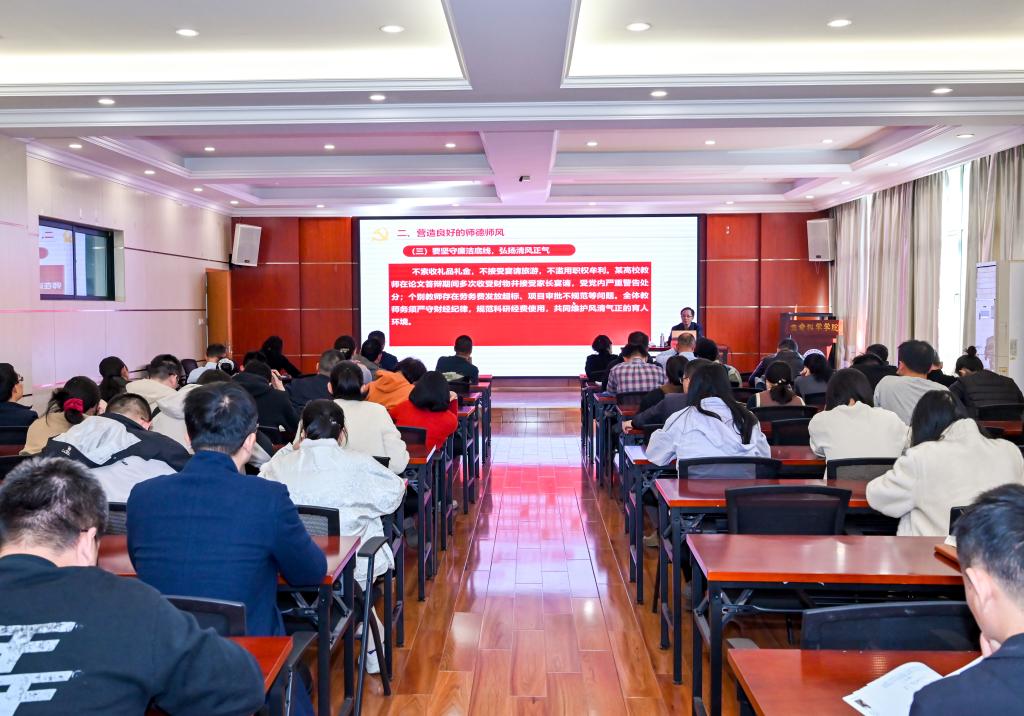 他强调,学院党委要高度重视,把师德师风建设作为党建工作的关键一环,既要抓日常监管,更要抓教育警示;既要抓问题整改,更要抓风险防范;既要抓好当下,又要抓好长远;全体党员干部要提高政治站位,扛起责任担当,切实履行好“一岗双责”,把师德师风教育融入平常、严在平常、成于平常,形成“常修常进、常抓常新、常管常严”的常态化机制;广大教师要加强自律意识,自觉遵守规范,坚守师德底线,共同打造新时代崇尚师德、勤廉师风的良好局面。