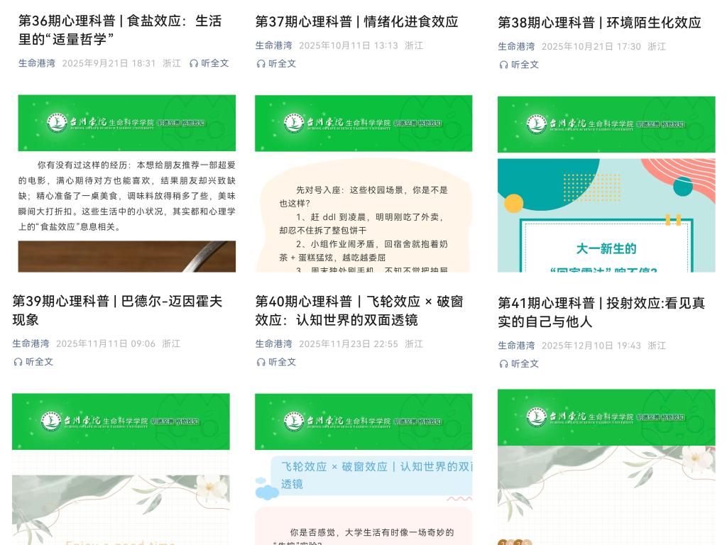 依托“生命港湾”学院微信公众号平台,开设半月一期的心理科普专栏,立足专业视角,将抽象理论转化为可感知的生活智慧,以通俗语言进行知识传播,构建起常态化、便捷化的云端心理知识传播阵地。本学期累计发布6期系列推文,成为覆盖全体新生的云端“心灵加油站”,助力学生构建科学心理认知体系。
