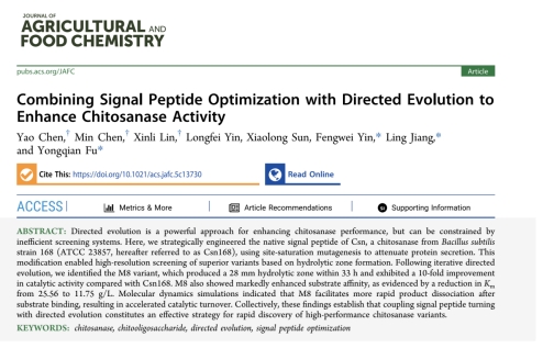 其中,题为“Enhancing Chitosanase Activity via Directed Evolution and Its Molecular Mechanisms”的论文由生命科学学院陈耀博士担任第一作者,台州学院付永前教授、孙小龙博士以及南京工业大学江凌教授为共同通讯作者。另一篇题为“Combining Signal Peptide Optimization with Directed Evolution to Enhance Chitosanase Activity”的论文同样以陈耀博士为第一作者,生物科学专业本科生陈敏和林新力为共同第一作者,台州学院付永前教授、尹丰伟博士以及南京工业大学江凌教授为共同通讯作者。
