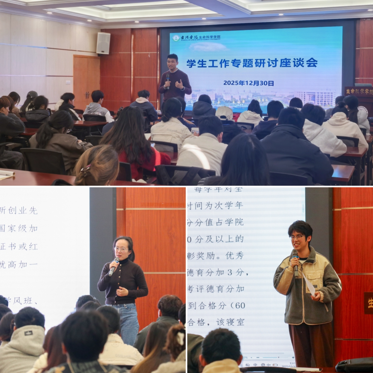 12月30日中午,生命科学学院在学院大会议室召开学生工作专题研讨座谈会。学院党委副书记陈鸿胜出席会议,学工办成员参会,学院团学干部、各班班长、团支书、学习委员、群众代表等100余名学生代表参加座谈,会议由学工办主任陈佳阳主持。
