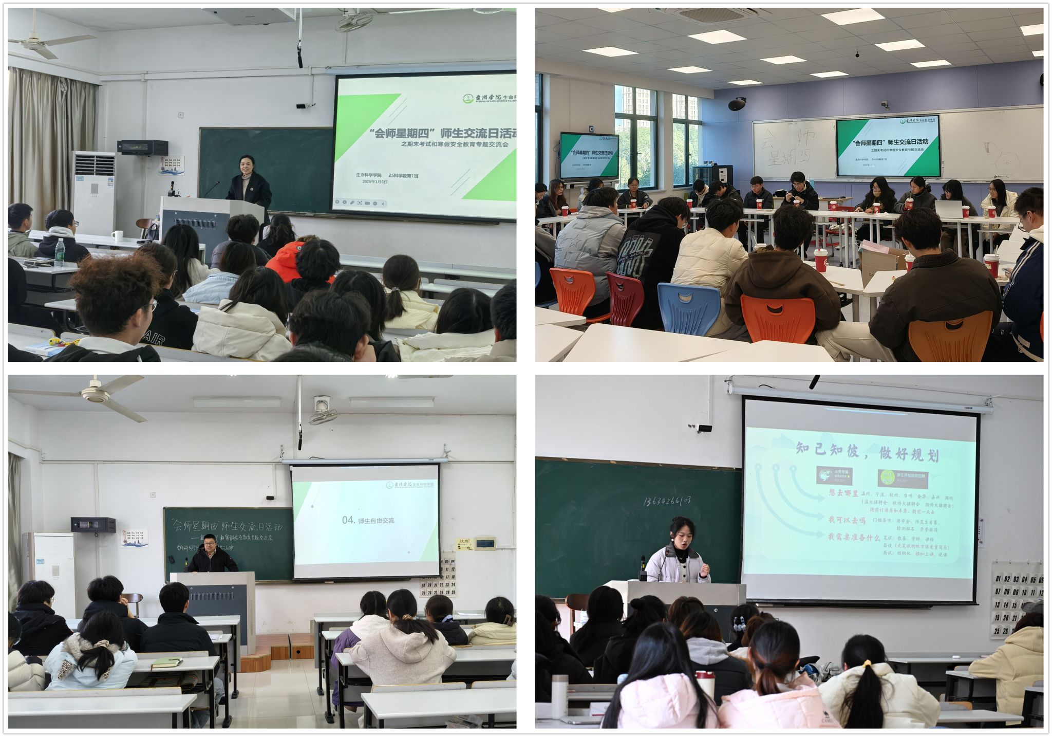 交流会上,各班班主任与学院领导班子成员、专任教师等深入课堂,围绕期末复习方法、应试心理调适、学业规划等方面,与学生开展面对面交流,细致解答疑问,疏导焦虑情绪,引导学生以积极、健康的心态迎接考试。在考风考纪教育环节,师生共同学习了《台州学院学生考试违规认定处理办法》《台州学院考场规则》等,结合以往典型案例开展警示教育,强调诚信应考的重要性,倡导“踏实复习、文明应考”的良好风尚,营造公平、公正的考试环境。针对即将到来的寒假,各班级围绕离校返乡安全、网络安全、实验室、宿舍安全管理及假期留校注意事项等内容开展了全面讲解和布置。班主任重点提醒学生注意防范电信网络诈骗、遵守交通规则、做好个人防护,并特别叮嘱参与科研实训的学生严格遵守实验室操作规程,杜绝安全隐患,确保平安度过假期。