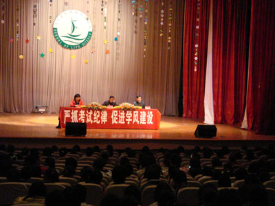 党总支王金宝副书记指出:我院的考纪考风总体情况比较好,但也有个别同学存有作弊动机和侥幸心理,希望每一个同学充分认识到加强考纪考风建设的重要性和考试作弊后果的严重性。他强调:考试不仅是对学生学习效果的检验,同时也是对学生理想人格特别是衡量是否诚信的一个的考验。严抓考试纪律、预防作弊行为的发生,是提高同学们平时学习积极性和主动性,促进学风建设,不断提高同学们的综合素质和自身修养的一个重要保证。如果考试作弊,将对今后的学习和就业带来了一系列的严重后果。