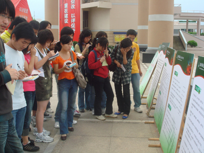 为了更好地营造迎评促建的良好氛围,强化同学们的文明规范意识。学院特举办了这次校园文明用语征集评选活动。该活动变过去“一人拟稿,领导点头”的封闭式采集方法,而是发动全院学生参与的开放型举措。同学们积极参与,竟相投稿,征集到内容涉及立志奋进、勤俭节约、迎评促建、学风建设、文明礼仪等各类标语达200多条。并于5月8日下午,对粗选后的80多条标语在学校教学长廊举行标语成果展以及评选活动。