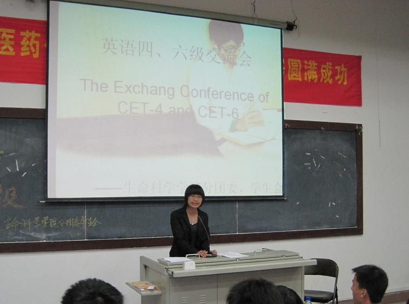 为帮助09级学生以轻松自信的心态迎接即将到来的英语等级考试, 4月25日晚,生命科学学院在临海一校区学术报告厅举办英语四、六级经验交流会。外国语学院俞米微老师和生命学院优秀考生代表参加了交流会。