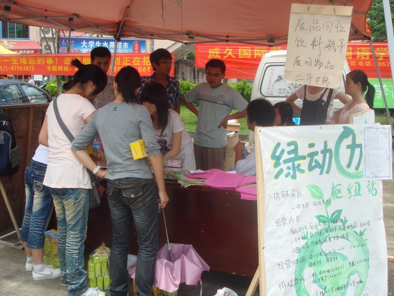 为培养大学生勤俭节约的良好作风,共建绿色环保友好型校园,用实际行动推广低碳概念、打造低碳环境、共建低碳家园,5月22日,生命科学学院在大学生超市门口开展“牵手自然.关爱环境”爱校护家绿色行系列活动之废品回收绿色行活动。