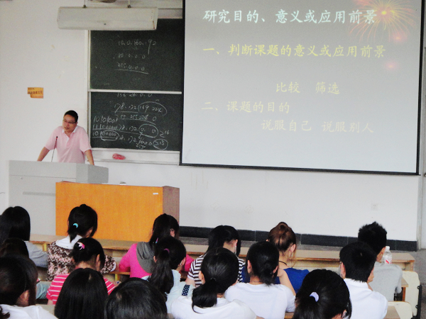 此次座谈会吸引了众多同学,白书立老师围绕着研究问题的一般框架进行阐述,要求同学们在进行科研前应明确研究目的和意义,并且依据目的制定具体可行的最佳实验方案去实施,最后总结出实验的结论。他还特别强调,每位同学都应有正确的科学态度,不得造假或是欺骗,以确保科研的严谨性和真实性。台上,白老师幽默的语言和深入浅出的讲解使得座谈会现场气氛轻松;台下,同学们认真聆听,仔细摘录,对申报科研项目有了更深一层的认识。随后,大四毕业生沈婷婷也从毕业论文的步骤和要点进行了详细的解说,使同学们受益匪浅。